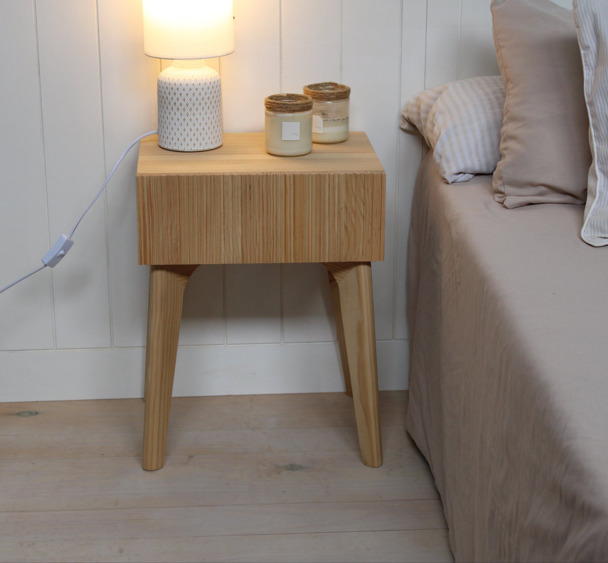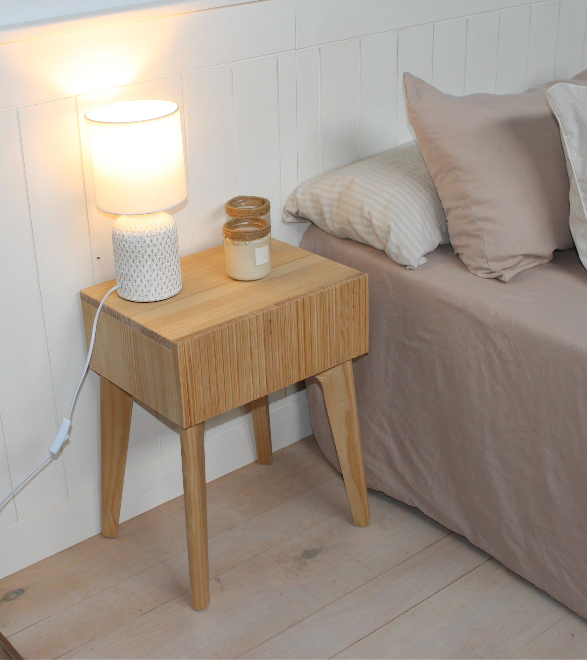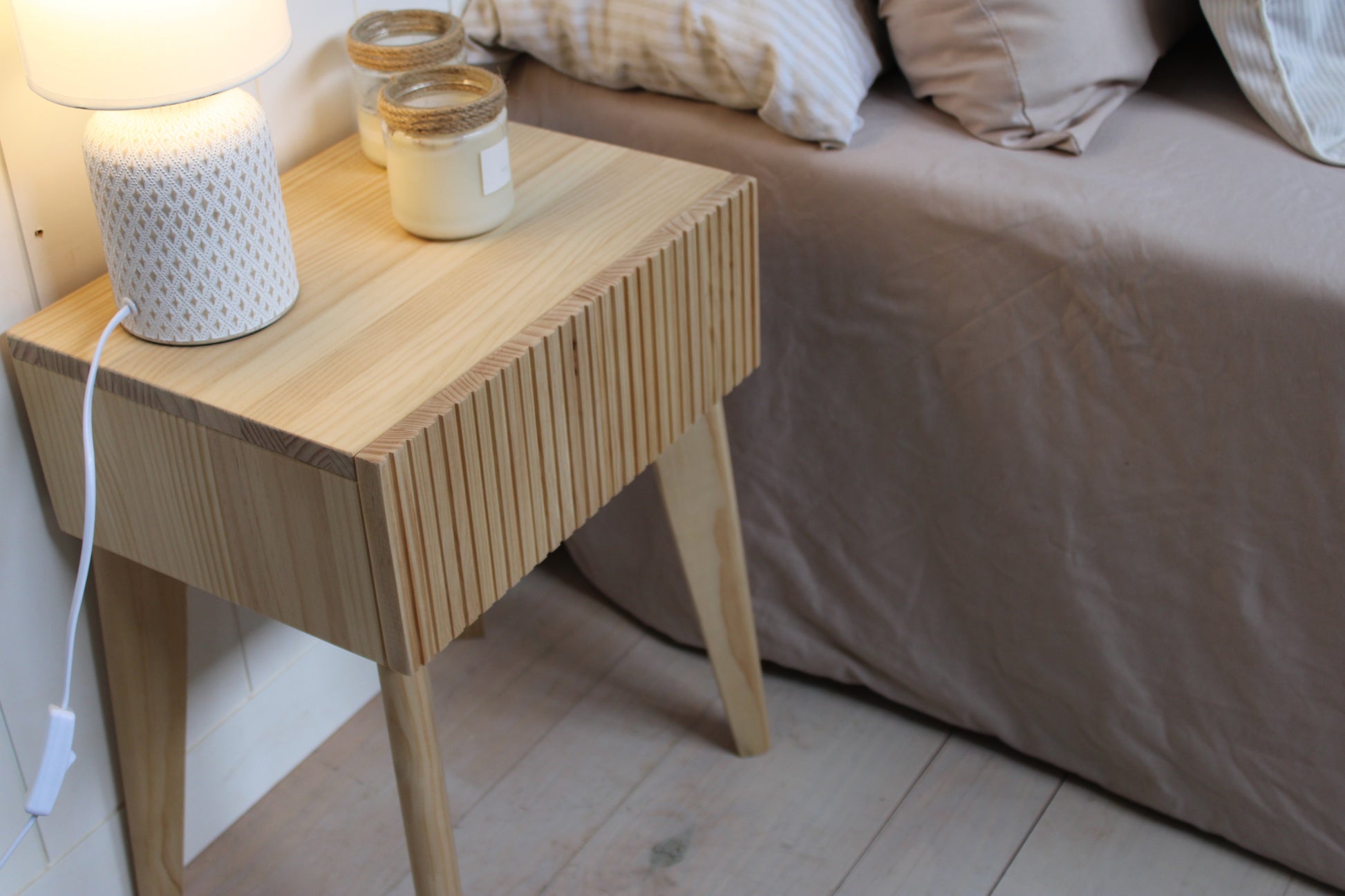 Mesita de noche 1 cajón rayado Iria, en madera maciza de pino.