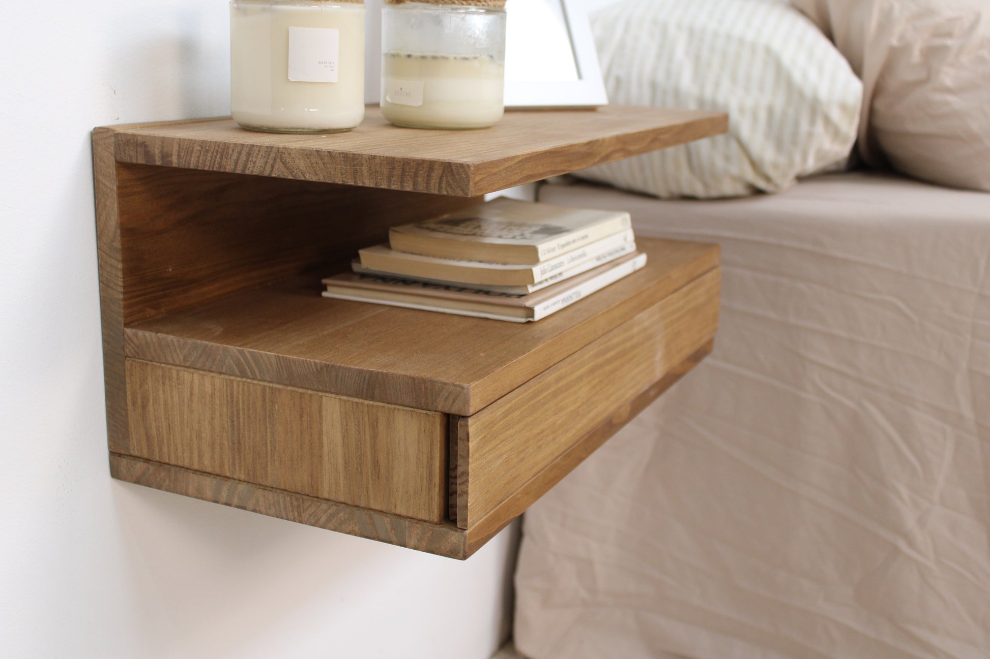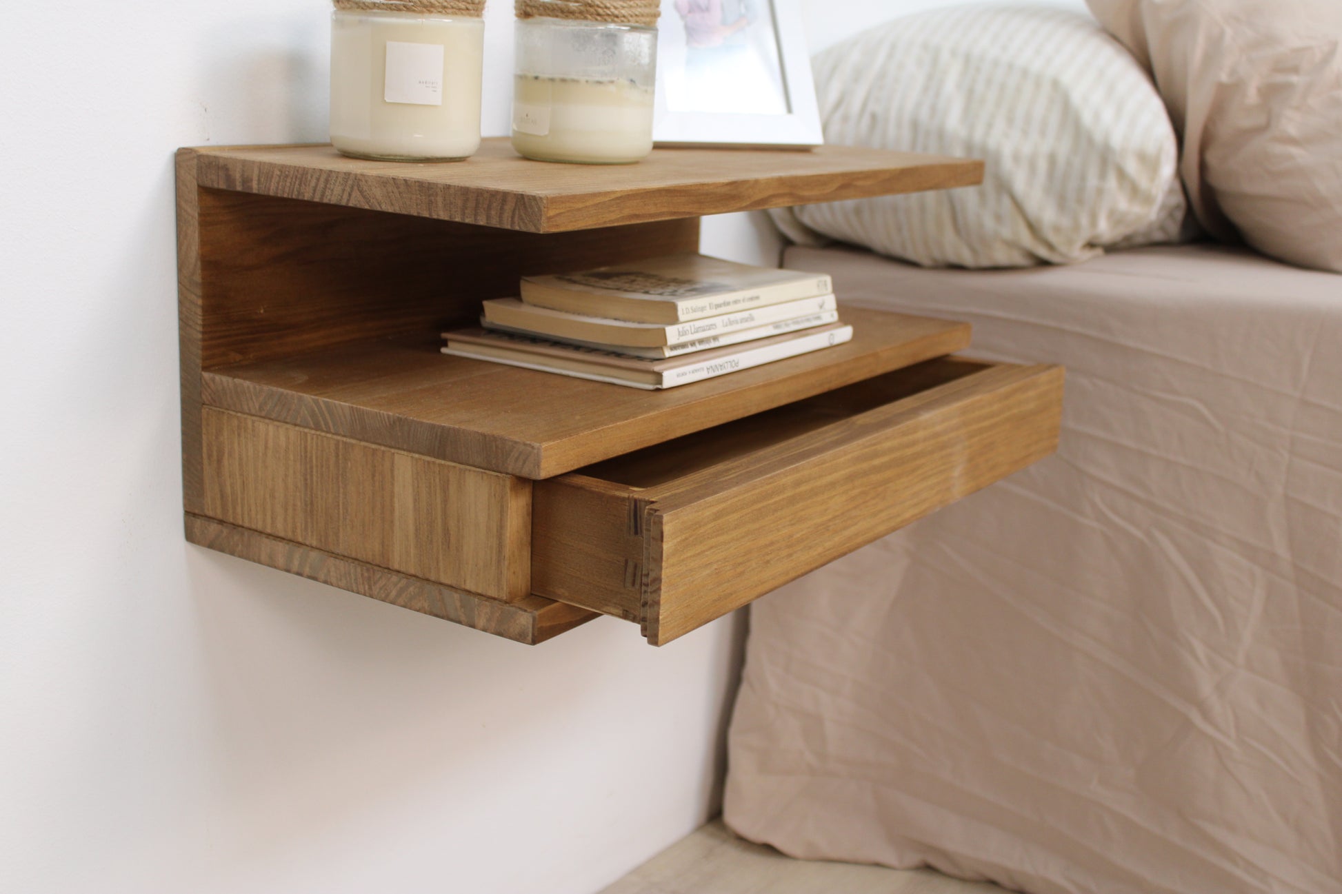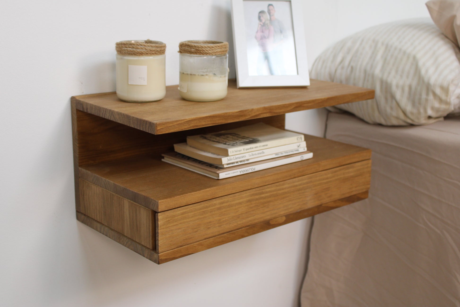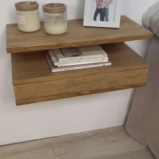 Mesita noche flotante/colgante con 1 hueco/ 1 cajón en madera maciza de pino.