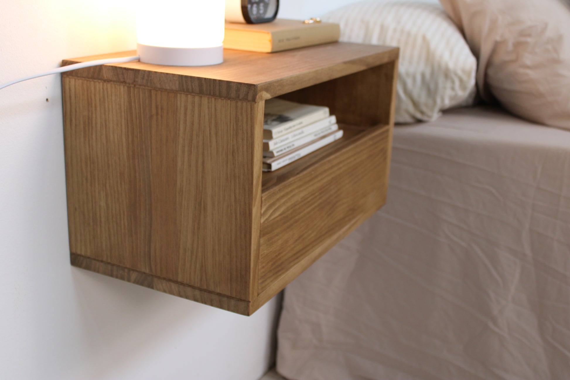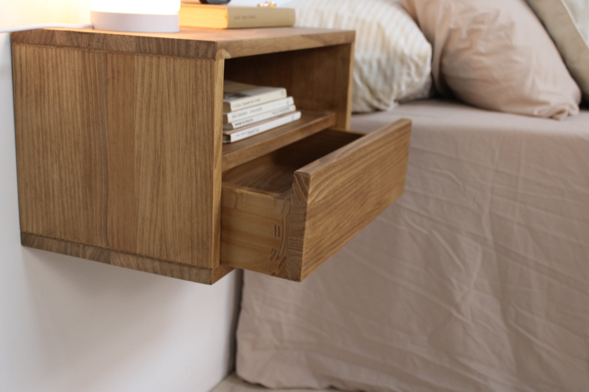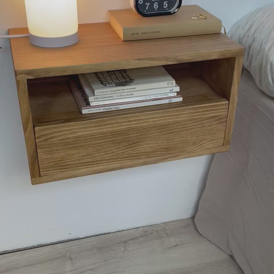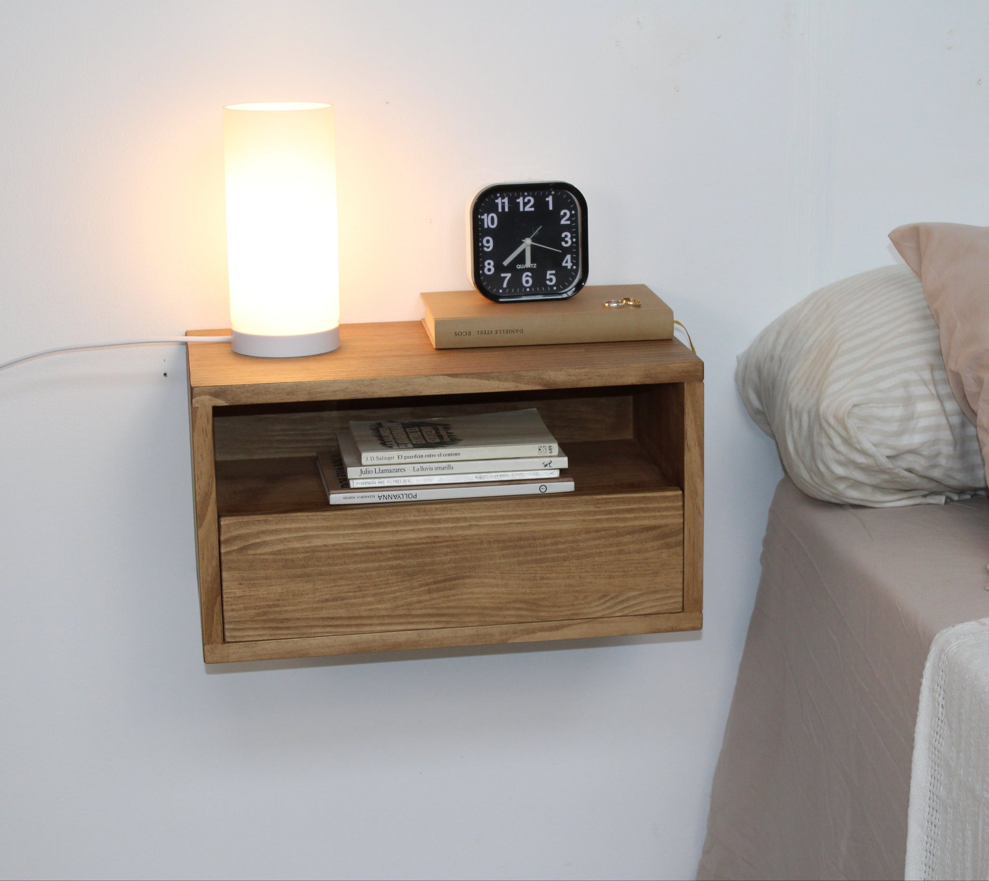 Mesita noche flotante/colgante ADA con 1hueco / 1 cajón en madera maciza de pino.